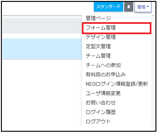 フォームアンサー管理画面、画面右上の管理メニューの「フォーム管理」からフォームを作成します。